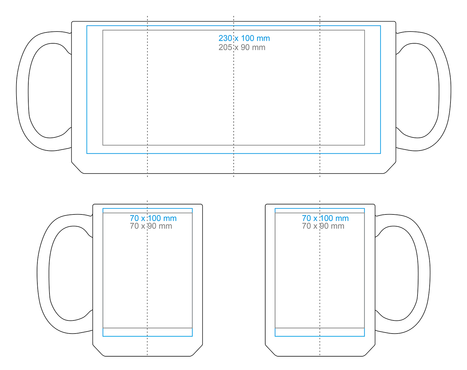 | Dostępne zdobienia dodatkowe Nadruk dookoła (pod uchem) Nadruk na uchu (100×10 mm) Nadruk wewnątrz (ścianka) (50×20 mm) Nadruk na dnie (wewn.) (ø50 mm) Nadruk na spodzie (zewn.) (ø45 mm) Nadruk złotem Nadruk srebrem Hand Made – malowanie rantu |
