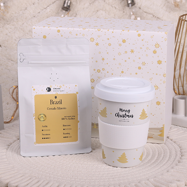 Mobilny kubek Coffee 2 Go z dedykowaną przykrywką i opaską 45mm chroniącą dłonie przed przegrzaniem, dostępnymi w wielu wersjach kolorystycznych, w towarzystwie pełnej aromatu kraftowej kawy ziarnistej Arabica Brazil Cerrado Mineiro 250g.